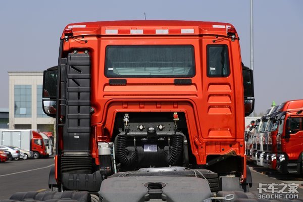 从后方看HOWO TX的驾驶室,除了进气系统占据一块区域,中间和右侧区域都布置了一个后风挡玻璃,进一步提升了内部的采光。
