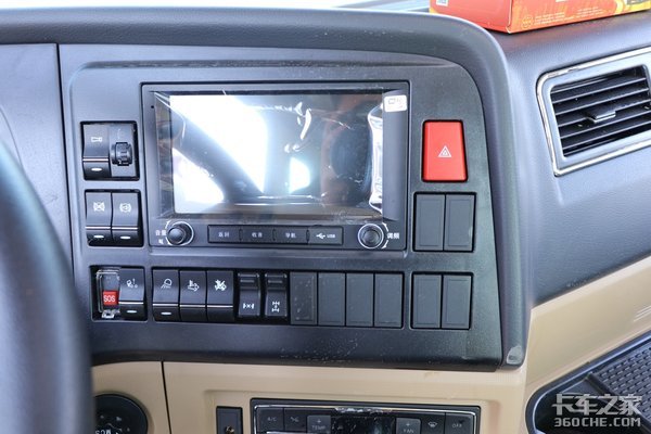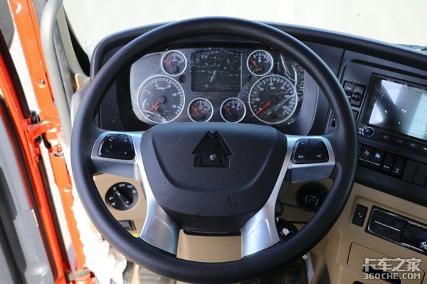 四辐方向盘集成了一些常用的按键功能在上面,司机开车听歌曲啥的不用分出手去操作。后面的6指针仪表盘是经典的重汽的款式,也可以说继承了德国曼的传统。