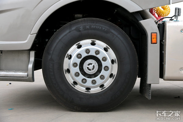 江铃威龙HV5采用康迈50万公里免维护轮端,延长了维护周期,提升运营效率,轮胎型号为米其林的X mult1,型号为常见的12R22.5。