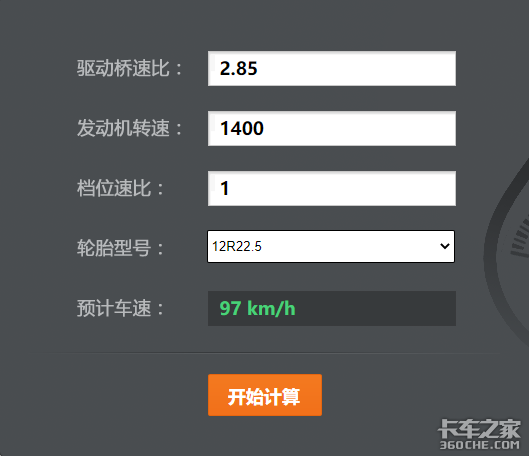 使用卡车之家车速计算器可以得知,当发动机转速在1400转时,车辆速度为97km/h。