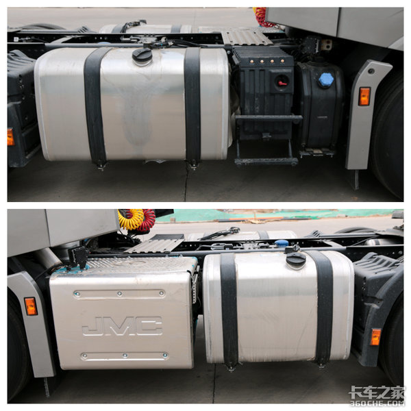 车辆左侧依次布置了后处理和油箱。右侧则布置了尿素罐、蓄电池和油箱,2个油箱加起来共计1050L的容积,按照百公里油耗33L计算,这辆江铃威龙HV5可以连续行驶约3100公里。