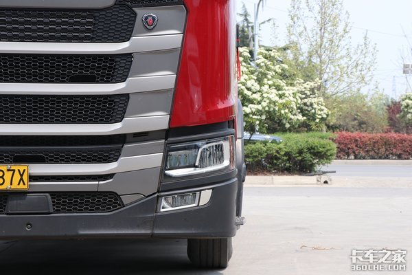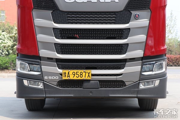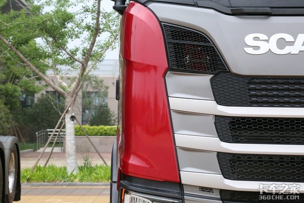 作为斯堪尼亚家族的旗舰产品,这款S500跟G系、R系最明显的区别在于前脸的高度。S系列的盾型中网一共分为四道杠,进气格栅基本等高,R系列虽然同为四道杠, 但是最上层的进气格栅高度要低于下面三个进气格栅,G系列更好区分,因为他的中网部分只有三道杠。实拍的这款车采用亮红色的涂装,看起来非常上档次