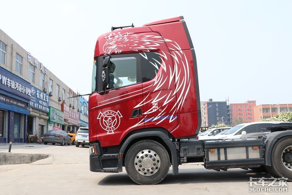 来到车辆的侧面我们可以看到这款S500的拉花非常的个性,大面积“狮身鹰面兽”的形象搭配上车标进一步的提升了车辆的辨识度。说来也是,这要是我的车我也要让路过的卡友都知道我开的是斯堪尼亚。