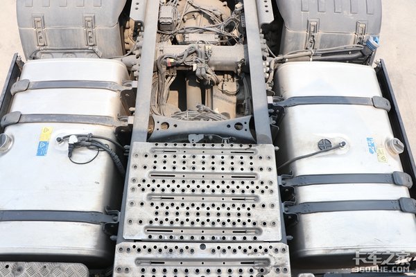 实拍的这款斯堪尼亚S500采用双油箱的结构,整个底盘的布局非常的紧凑,铝合金壳体的油箱单个容积为500L,统共1000升的油箱搭配上斯堪尼亚优秀的节油体系,续航里程毋庸置疑。