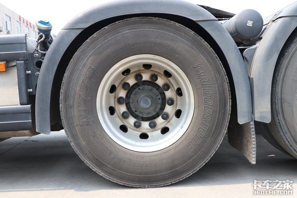 实拍的这款斯堪尼亚S500的轮胎来自于品牌普利司通,轮胎规格为295/80R22.5。全车的轮圈都是为铝合金材质的,有效的降低了车辆地盘自重。