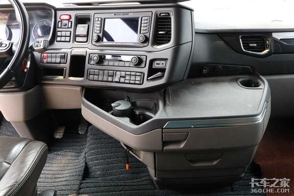 再向右边看就是斯堪尼亚的中控台部分,半围绕驾驶员的中控台设计更方便驾驶员进行人机交互。中控台从左至右分别安置有电子驻车制动、多功能按键、7英寸大媒体大屏以及自动空调系统等。在中控台的下方还安装有一个置物架,由一个小尺寸的储物盒、烟灰缸以及一个杯槽组成。