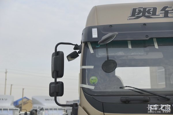 虽说车辆没有装配导流罩,但是驾驶室顶部“大背头”的设计语言其实作用和导流罩也没差多少了。“奥铃”花体字的浮喷让车辆的辨识度更高,标配的遮阳板可保证驾驶员在朝阳面行驶时,不被光线干扰到驾驶,并且遮阳板两侧嵌有两块示廓灯,夜间行车时可以更好的警示对象行车。