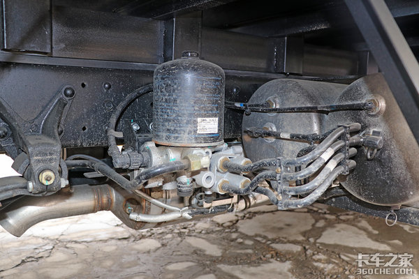 车辆底盘右侧布局有来自瑞立品牌的空气处理单元和铝合金材质的双储气罐,这使得车辆气路稳定性更好,后者还能满足车辆的频繁用气需求。此外整车底盘气路布局十分规整,可见陕汽轻卡厂家的用心和优秀的制造工艺。