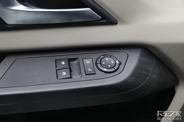 主驾门板集成有电动车窗、电后视镜调节、电加热以及中控锁功能,驾乘体验得到了明显提升。这样我们坐在驾驶室内就可以轻松调节后视镜视野,并且当后视镜上沾到雨雪等水汽时,我们还可以通过电加热功能来进行去除,无需用抹布在主驾和副驾之间来回擦拭。