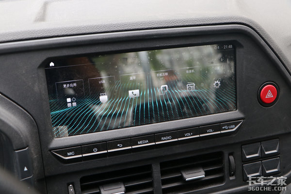 中控操作区域布置有10寸多媒体液晶屏,显示效果细腻,菜单的设计和操作灵敏度上都比较让人满意。除了一些常规的倒车影像、影音娱乐、蓝牙等功能之外,该多媒体还支持手机互联功能,解锁更多玩法。中间布置有DPF再生按键和禁止按键,最下面则是空调系统。