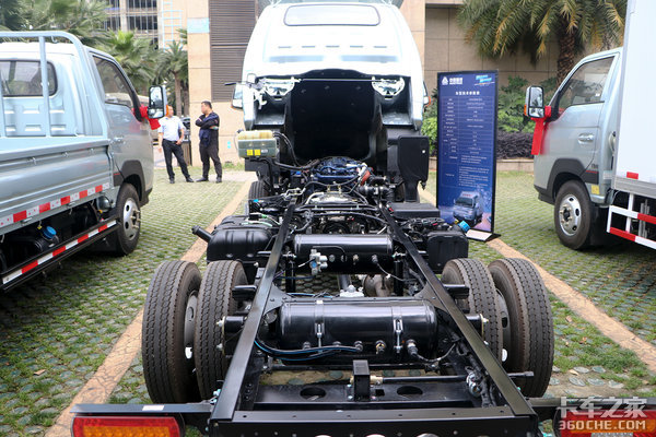 底盘方面,匹配腹高160mm直通大梁,配备3.5吨后桥,底板横纵梁采用铆接+螺栓结构,速比4.333,整辆车的承载能力完全是向轻卡看齐,运输大件重货完全没问题。并且该车前后桥均配备有横向稳定杆,可减少侧倾发生、增加行车稳定性。另外还带有气刹制动,保障车辆在满载下的制动性能。