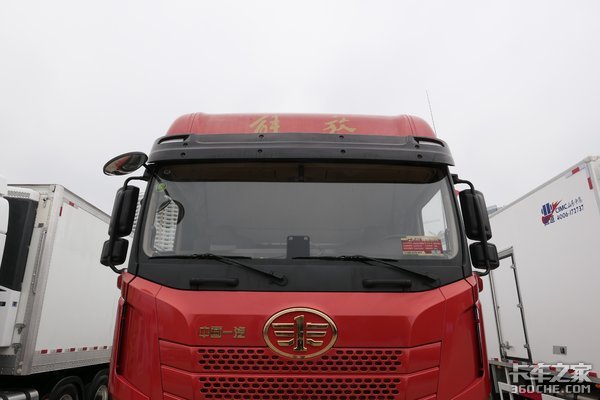 高顶驾驶室顶部导流罩还是用巨大的毛体写的解放二字。外置的遮阳罩能在一定程度上保护司机免受紫外线和阳光的影响。