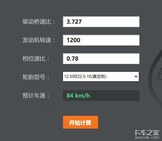 使用卡车之家车速计算器可以得出,当发动机转速为1200转时,车辆速度可达到84km/h。
