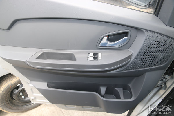 虽然驾驶室的宽度从数据上看并不理想,不过麻雀虽小但五脏俱全,在飞碟Q3的车门板上我们依旧看到了该有的配置,电动升窗按键、后方底部封死的储物槽可以防止手机、下方带有杯架功能的储物槽尺寸也比较大。虽然驾驶室宽度一般,但是飞碟汽车还是通过巧妙的设计保留了所有的功能。