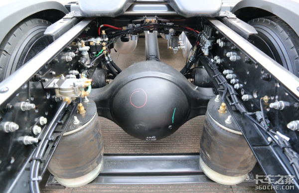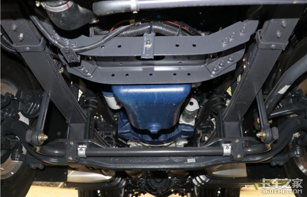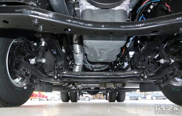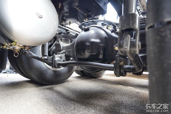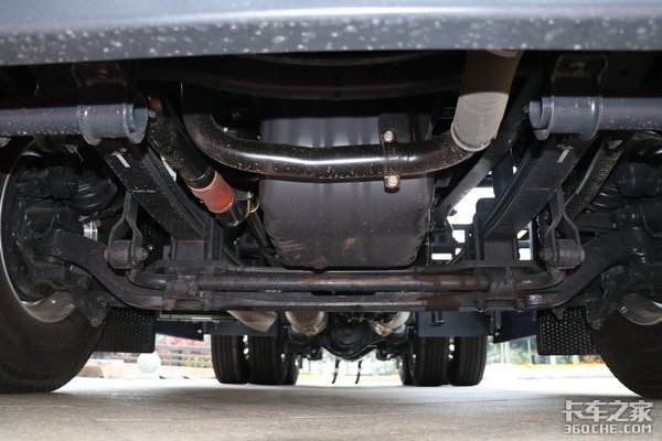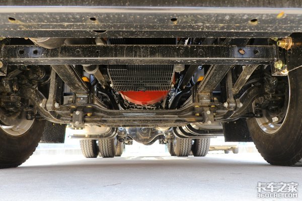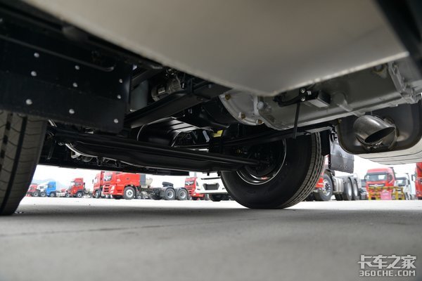 底盘方面,该车的车架高度为280mm×80mm×8mm,采用前2后3的少片簧设计。前后桥是采用的6.5T免维护前桥和435免维护后桥,速比为3.083。