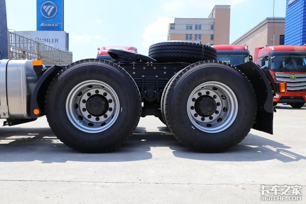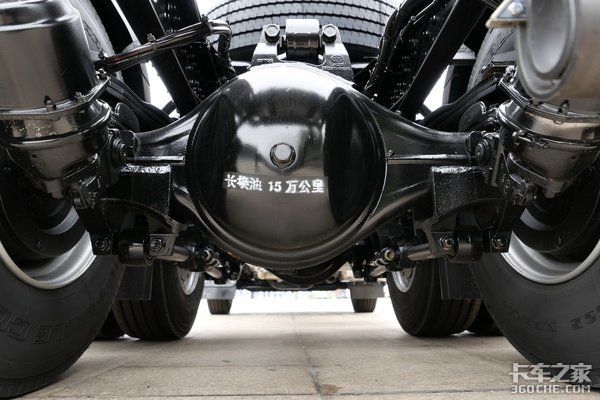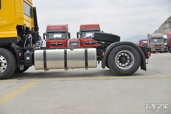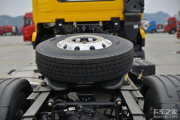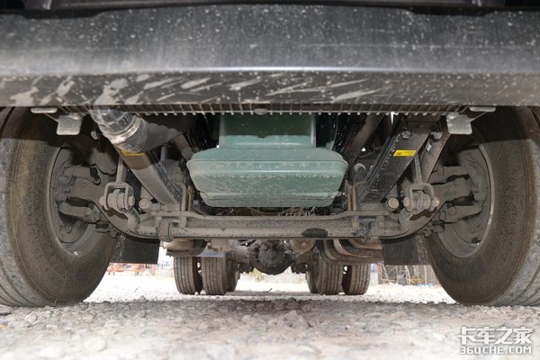 该车悬架的板簧采用2/4的形式,后桥为2×440,速比为3.7。双油箱设计,采用铝合金材质,总容积达到600L+400L。轮胎是装配了12R22.5型号的朝阳牌真空胎,其特点就是耐用和省油,可以节约成本支出。