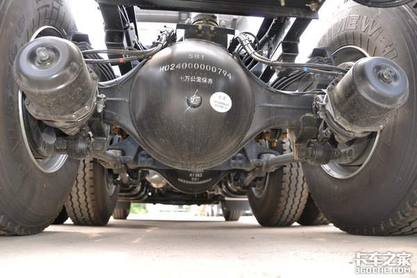 底盘方面,前后桥都采用的是汉德的免维护产品,后桥采用的是汉德13吨后桥,速比有2.864、3.083等多种选择,后桥达到了50万公里质保,终身免维护,前后桥都采用的钢板弹簧,卡友也可根据需要选装后气囊悬架,整车采用的是盘式制动,配备铝合金轮辋。