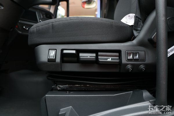 驾驶室内的亮点也不少,驾驶室采用四气囊减震,主驾座椅则采用的是伊思灵气囊减震座椅,带有双扶手、一体式安全带、通风功能,并且座椅靠背角度、气囊软硬、前后位置等都可调节。