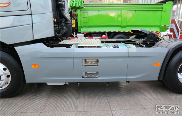 底盘左侧布局容积了60L的尿素罐、750L的铝合金大容量油箱,大容积满足跑干线时持续的续航要求。