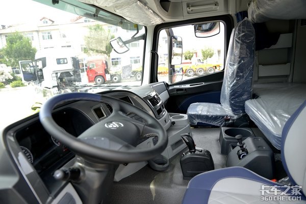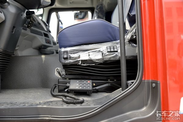 该驾驶室除了气囊悬置外,还配置了8向可调节的皮革材质气囊座椅,采用了人体工程学设计。除了常规的一键充放气、坐垫及靠背仰角可调外,并且还带有可调腰托,,能够有效保护驾驶员的腰部,降低长时间开车时腰部劳损。