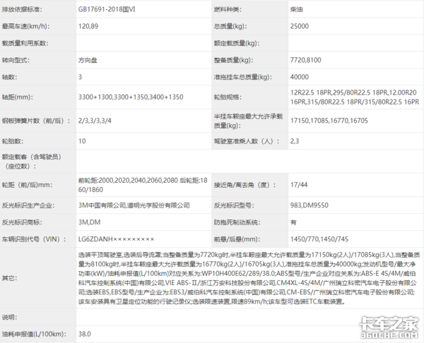 另外该底盘整备质量为7720、8100kg,重量在该级别也是主流水准,准拖挂车总质量为40000kg。
