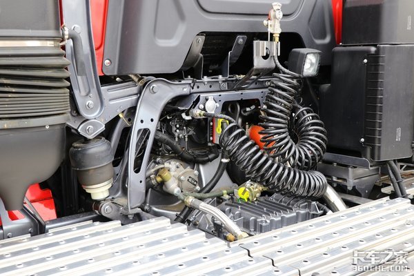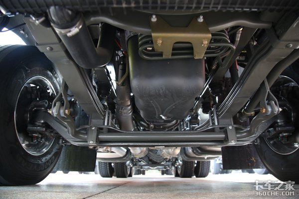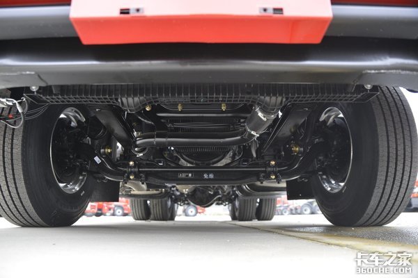 车辆前桥采用3片少片簧结构设计,重汽MCY13BES后桥,并带有提升气囊结构,可以快速匹配挂车、完成甩挂,同时还能够缓解颠簸、坑洼路面所带来的冲击,提升舒适性,同时对于高价值货物也能起到一定保护作用,后桥速比为3.7。配备铝合金双油箱,总容积为600L+200L。