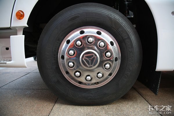 该车采用7.3吨前桥、13吨后桥,后桥达到了50万公里质保,终身免维护。前少片簧后空气悬架的底盘结构,有助于提升运营效率和舒适性,降低货物破损几率。采用铝合金车轮,规格为315/80R22.5。整车配备盘式制动,响应更灵敏、质量更轻。配备有铝合金双油箱,容积分别为690升+300升,并带有油箱加热功能。