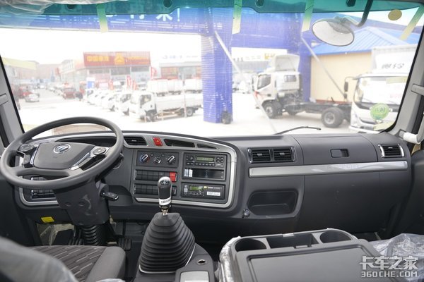 中控台的配置较为一般,没有中控屏。不过配置还算齐全,左侧有空调系统、DPF再生按键和禁止再生按键等;右侧是收音机、行车记录仪、USB接口和一个小的储物格等。另外,虽然没有中控屏,但该车可以选装,能够实现导航、影音娱乐、倒车影像等功能。