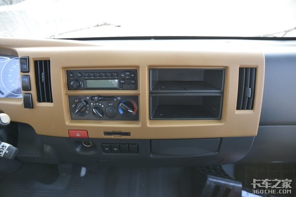 相较于个性十足的外观设计,骏铃A8的中控台就显得比较朴素了,不过好在棕色的面板为其加分不少。左侧为空调和收音机区域,右侧布置有两个储物格,可以用来放置手机、钥匙等。