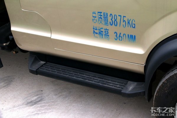 考虑到日常的运输工况需求,瑞帅F2可能需要行驶在非铺装路面,所以整车的离地间隙较高,以满足各种路况需求。但正因如此,瑞帅F2的车身高度较高,卡友上下车的姿态可能会比较狼狈,所以南骏还贴心的在瑞帅F2车门两侧设置了蹬车踏板,方便卡友上下车。