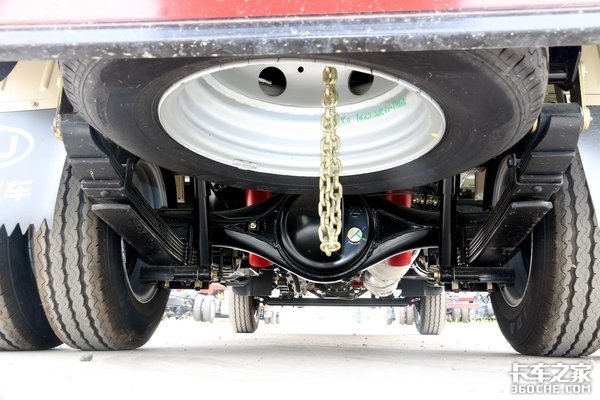 瑞帅F2使用了前后钢板悬架的设定,实拍车型前后片数为4/5,如果觉得承载强度不够,瑞帅F2还提供更多的片数设定。此外,瑞帅也提供多种后桥速比可选,从3.909到5.375不等,卡友也可根据自己平时的载重量、线路来进行自由选择。