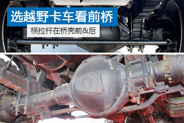 其他厂家的整体式前桥,桥壳是组装式的,横拉杆在桥壳之前。当前方有障碍物的时候,横拉杆首当其冲,容易被损坏。