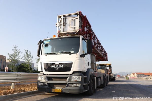 今天给大家介绍一款:全进口方式进入国内的,采用曼恩底盘,意大利百灵桁架式上装的桥梁检查作业车。这是一条未开通的施工路段,白色车身红色上装的它停在这儿并不引人注目,但让你仔细一看,也许你能感受到它并不简单。