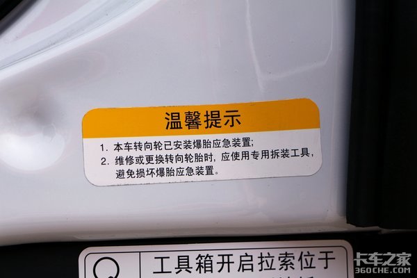 同时,了解牵引车相关规定的老卡友们也都知道,限速不是89km/h,而是100km/h的车,一般都带了爆胎应急装置等等高科技的安全辅助配置。而我们也确实在车门上,找到了相关的标识。