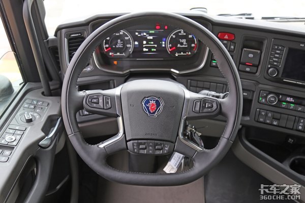 说到斯堪尼亚上最令卡友们满意的配置,我想要属方向盘下方的这个怀挡形式的变速箱操作杆了。怀挡式的变速箱操作形式,不仅节省了驾驶室的空间,同时在操作上也非常的简单,当我们将变速箱切换为手动干预模式后,只需上下拨动怀挡挡把,即可进行加减挡位的操作。当我们前后拨动挡把时,即可对液力缓速器进行操作,当然,斯堪尼亚的液缓同样可调节为自动挡。