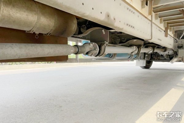 天锦大单桥的传动轴是三节布置,底盘下方有两处支撑,这种结构的成本比较低,而且比较轻。