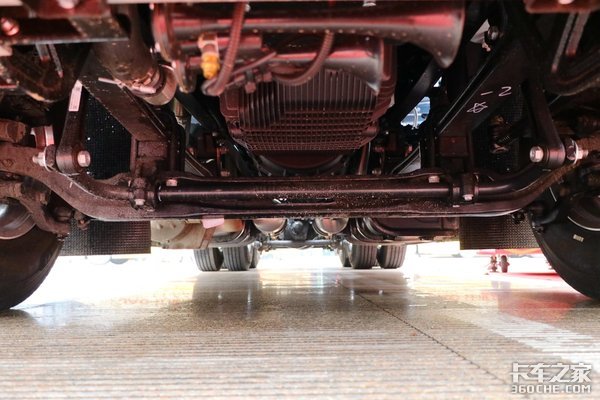 底盘方面,该车采用了国内知名品牌小速比中后桥,速比有2.85、2.64两种可选。车架是采用和跨越K7同平台的280mm截面高强钢结构,悬架形式为前悬架2片簧,后悬架8气囊设计。