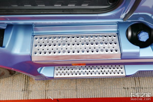 最后就是驾驶舱配置方面了,因为江淮跨越V7是长头车,驾驶室的高度相比较平头车来说更低一些。一般平头车的蹬车踏板为四层阶梯式设计,而这款江淮跨越V7采用两层式设计,一级踏步离地高度为45公分,二级踏步高度间隔35公分,符合中国人自己的登车习惯,即使一不小心踏空了,也不会对身体造成太大的损伤。