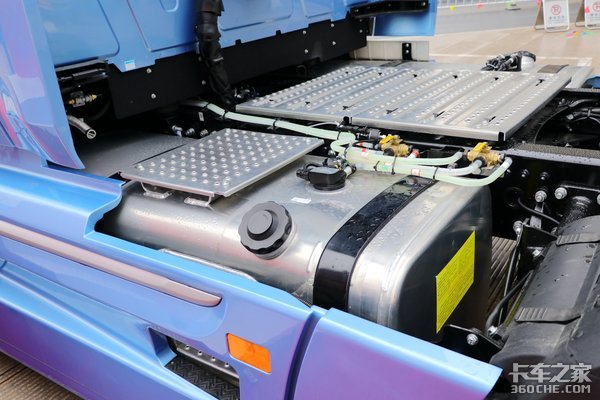 油箱是配置的双油箱,左右两侧各挂一个,容积为600L+600L。根据干线物流车辆30-35L的油耗来计算,1200升的油箱跑3000-4000公里完全没问题,一次加满途中也不需要停车加油,既提高效率,又能节省一定的用车成本。此外,该车的左右油箱采用切换转换阀控制,主油箱配置燃油水加热功能,卡友们冬天行车再也没有后顾之忧。