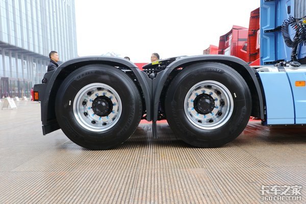 全车标配规格为12R22.5型号的米其林轮胎,具有低滚阻、寿命长、抓地力强等特点。我们也可以根据发动据转速、变速箱挡位比、后桥速比(2.85)、轮胎型号通过卡车之家车速计算器算出:这款车在900-1400rpm这个转速区间时时速在64~100km/h。