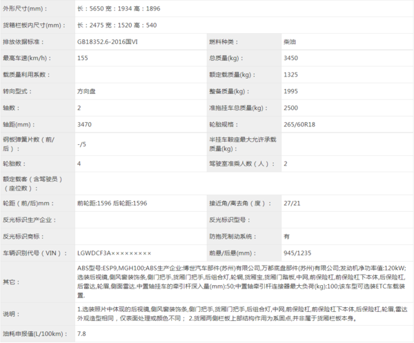 从申报信息来看,车辆的外形尺寸达到了5650x1934x1896mm,车辆轴距达到了3470mm,车身尺寸与商用版长轴距车型相近,对于皮卡车型来说相当魁梧。而大车身自然能够带来大货厢,该车的货厢内尺寸也达到了2475x1520x540mm,装载能力也相当出色。