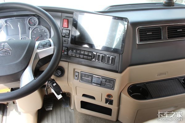 在方向盘的右边就是车辆的中控台,半包围驾驶员的设计更加方便人机交互。中控台位置集成有多功能按键区域以及一块超大尺寸的彩色大屏,这块大屏幕可满足卡友日常的娱乐需求,听歌、看电影、开导航都方便了许多。