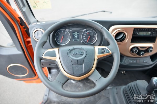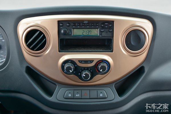 在中控区域,实拍车型也同样采用了大尺寸的鎏金配色饰板,不仅视觉效果很赞,而且有效提升内饰的视觉质感。在配置方面,康铃J6拥有收音机和空调的设定,并且都采用了大尺寸的实体按键,使用起来非常简单。