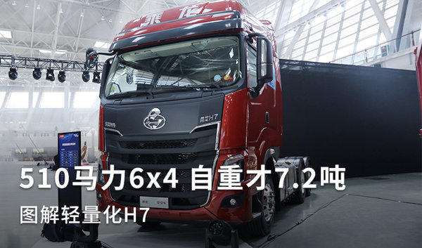 同时作为该车的一大亮点,510马力,6x4驱动,市面上同类的牵引车重量基本都是8.8吨左右,轻一些的也是在8吨这个线上。那么轻量化乘龙H7是如何做到7.2吨的质量的呢?