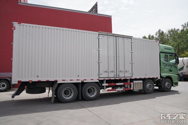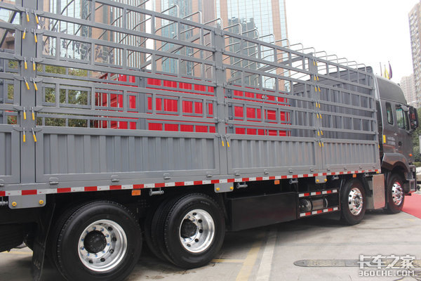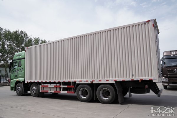 承载性:实拍的这款J7载货车为8×4驱动形式,其轴距做到了2000mm+4500mm+1350mm。货厢为厢式,尺寸为9400mm+2460mm+2600mm。有需求的卡友也可以选择仓栏式货厢。2/2/4的钢板弹簧悬挂形式,在保证车辆轻量化的同时,还能很好的保障车辆的承载能力。