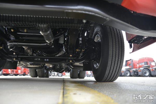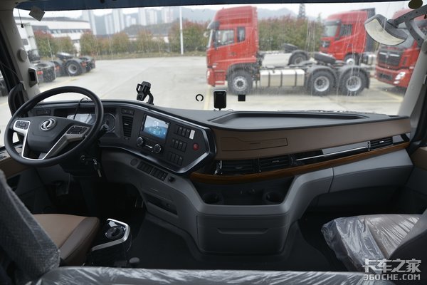 实拍的这款东风天龙旗舰KX装配有一高顶双卧平地板驾驶室,驾乘空间都非常宽敞,四点气囊悬浮的悬挂形式可以很好的保证车辆在经过颠簸路段时的平稳性。