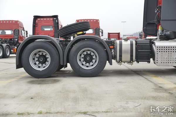 后桥方面,这款600马力的东风天龙旗舰KX选择的是速比为3.64的东风德纳440级后桥,车辆选配的轮胎规格为12R22.5 18PR,前轮采用米其林轮胎,后轮为东风风神轮胎。通过卡车之家车速计算器可以算出来,当车辆的发动机处于经济转速区间时(900~1400rpm),车辆时速可达到62~97km/h(同时可选速比为3.42的后桥,发动机处于经济转速区间车速可达66~104km/h)。