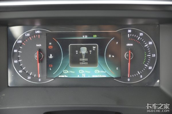 车辆的仪表盘采用双筒式+中间液晶显示屏的设计,左右两边集成式设计了发动机的转速表以及车辆的时速表,中间的液晶屏幕,除了显示车辆信息以及行程信息外,还可以对驾驶行为进行显示,方便驾驶员寻找到最佳的驾驶状态,规范驾驶员的驾驶习惯,从而达到节油效果。