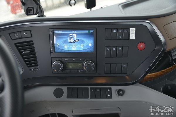 再往右看就是半包围驾驶员设计的中控台,大尺寸的MP5可满足卡友日常行车时的影音娱乐、导航等需求;下方的自动空调保证了卡友们行车时车内温度的事宜;最右方以及空调下方则安置的是多功能按键,不仅操作方便,并且功能一目了然。