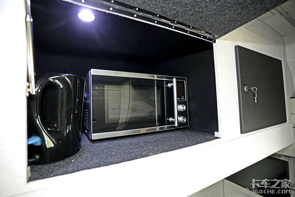 针对单人驾驶的欧洲卡友来说,S-WAY还可以提供更多的舒适性配置,除了标配水壶以外,微波炉和咖啡机都可以进行选装,放置在上卧铺位置。对于单人驾驶而言,上卧铺本身就是一项可有可无的配置,将这个区域改造为舒适性配置以及储物格会更加实用。